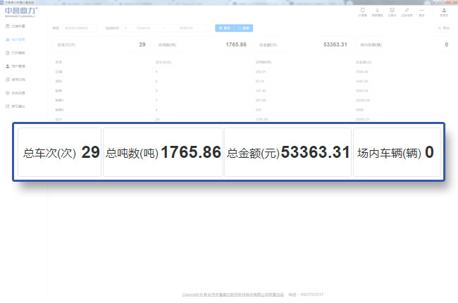 對過磅類型、特點時間段或全部時間段的車次、噸數(shù)、金額等進行匯總,并可以直接導(dǎo)出報表;