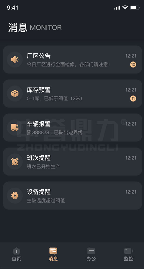 包含廠區(qū)公告、庫存預警、車輛報警、班次提醒、設(shè)備提醒的消息通知,支持離線通知