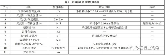 砂石骨料一般分為粗骨料和細(xì)骨料兩種,粒徑大于5mm的為粗骨料,小于5mm的為細(xì)骨料。粗骨料按粒徑80~150mm為特大石,40~80mm為大石,20~40mm為中石,5~20mm為細(xì)石;細(xì)骨料分為粗砂、中砂和細(xì)砂。骨料質(zhì)量管理主要控制粗骨料的遜徑和細(xì)骨料的石粉含量及細(xì)度模數(shù),混凝土用砂石骨料加工,質(zhì)量要求詳見(jiàn)下表。