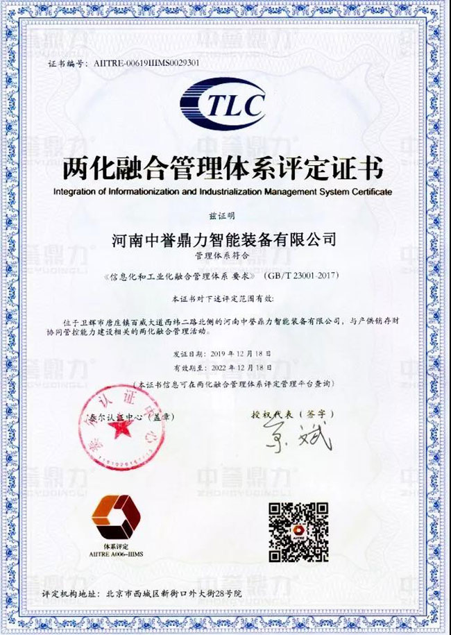 日前,河南中譽鼎力智能裝備有限公司正式通過兩化融合管理體系貫標(biāo)認(rèn)證,取得工信部的評定機構(gòu)頒發(fā)的“兩化融合管理體系評定證書”。