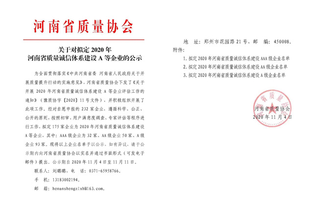 為面貫徹落實《中共河南省委河南省人民關(guān)于開展質(zhì)量提升行動的實施意見》,河南省質(zhì)量協(xié)會下發(fā)了《關(guān)于開展2020年河南省質(zhì)量誠信體系建設(shè)A等企業(yè)評估工作的通知》(豫質(zhì)協(xié)字[2020]11號文件),中譽鼎力軟件科技股份有限公司積參評。公司自成立以來,堅持“一言九鼎誠信天下”的經(jīng)營理念,秉持對客戶負責(zé)的態(tài)度,以工匠精雕鑄鼎力品質(zhì),不斷開拓公司業(yè)務(wù),樹立了守法履約的良好企業(yè)形象和客戶口碑,入選“2020年河南省質(zhì)量誠信體系建設(shè)AA級企業(yè)”名單。