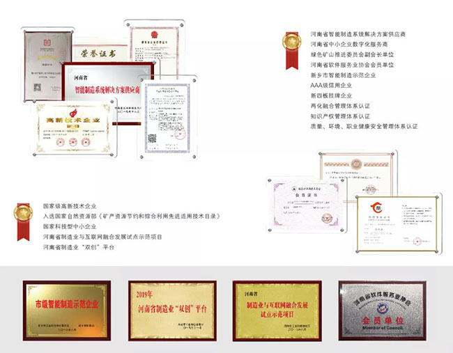 新鄉(xiāng)市中譽鼎力軟件科技股份有限公司自2017年6月成立以來,專注于礦山行業(yè)智能管理解決方案,憑借的技術人才、豐富的行業(yè)經(jīng)驗、扎實的研發(fā)生產(chǎn)、科學的管理體系等多方面的優(yōu)勢,不斷推動技術創(chuàng)新,在日趨激烈的市場競爭中快速前行,榮獲家級高新技術企業(yè)、河南省工程技術研究、河南省制造業(yè)與互聯(lián)網(wǎng)融合試點項目、河南省制造業(yè)“雙創(chuàng)”平臺、河南省智能制造系統(tǒng)解決方案供應商、新鄉(xiāng)市智能制造企業(yè)、AAA級信用企業(yè)等數(shù)十項稱號,并通過ISO9001質量管理體系、知識產(chǎn)權管理體系認證。