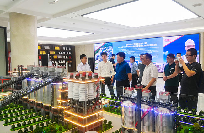 隨后,考察團(tuán)一行來到河南中譽鼎力智能裝備有限公司,實地參觀了中譽鼎力礦山管理云數(shù)據(jù)和多位一體循環(huán)建材產(chǎn)業(yè)園項目沙盤,并進(jìn)行座談。