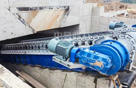 右側(cè)為中譽(yù)鼎力重型板式給料機(jī)結(jié)構(gòu)圖,該設(shè)備主要由鏈板裝置、拉緊裝置、驅(qū)動(dòng)裝置和主軸裝置等部分組成。