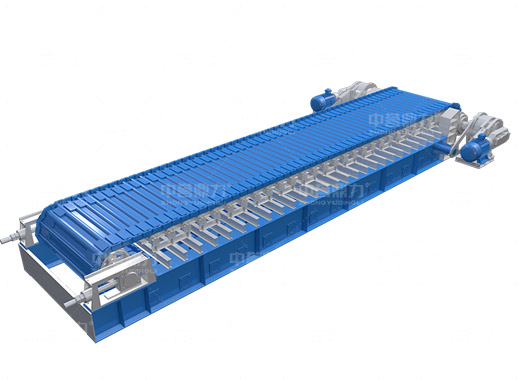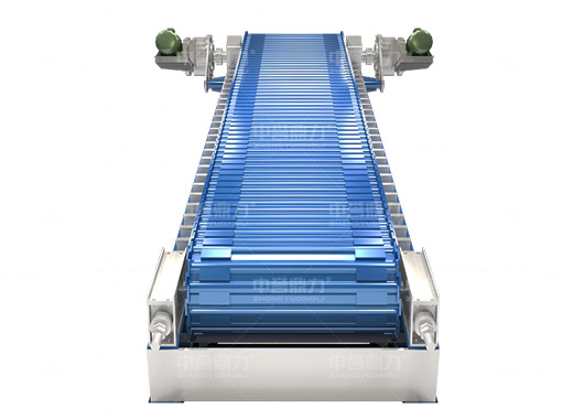 電動(dòng)機(jī)轉(zhuǎn)動(dòng),通過(guò)傳動(dòng)軸和驅(qū)動(dòng)裝置,帶動(dòng)主軸旋轉(zhuǎn),鏈輪和鏈條安裝在主軸裝置上,通過(guò)該裝置帶動(dòng)鏈條上的鏈板做直線運(yùn)動(dòng),鏈條上安裝有承料槽板,鏈板的直線運(yùn)動(dòng)將物料均勻的帶到鏈條的槽板上,并向前輸送,達(dá)到輸送物料的目的。