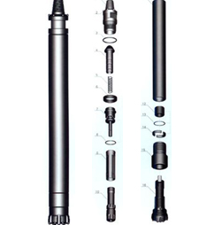 活塞、內(nèi)缸、配氣座、逆止閥和鉆頭附件等安裝在細(xì)長(zhǎng)的外缸內(nèi),外缸上端裝帶扳手口和聯(lián)接螺紋的上接頭,下端裝有螺紋連接的卡釬套。