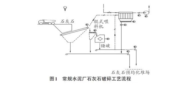 該水泥廠原有石灰石碎石生產(chǎn)線為重型板式喂料機(jī)+波動輥式喂料機(jī)+重錘式破碎機(jī)體系,聯(lián)合粉碎能力通常在900~1100噸/時,工藝流程見圖1: